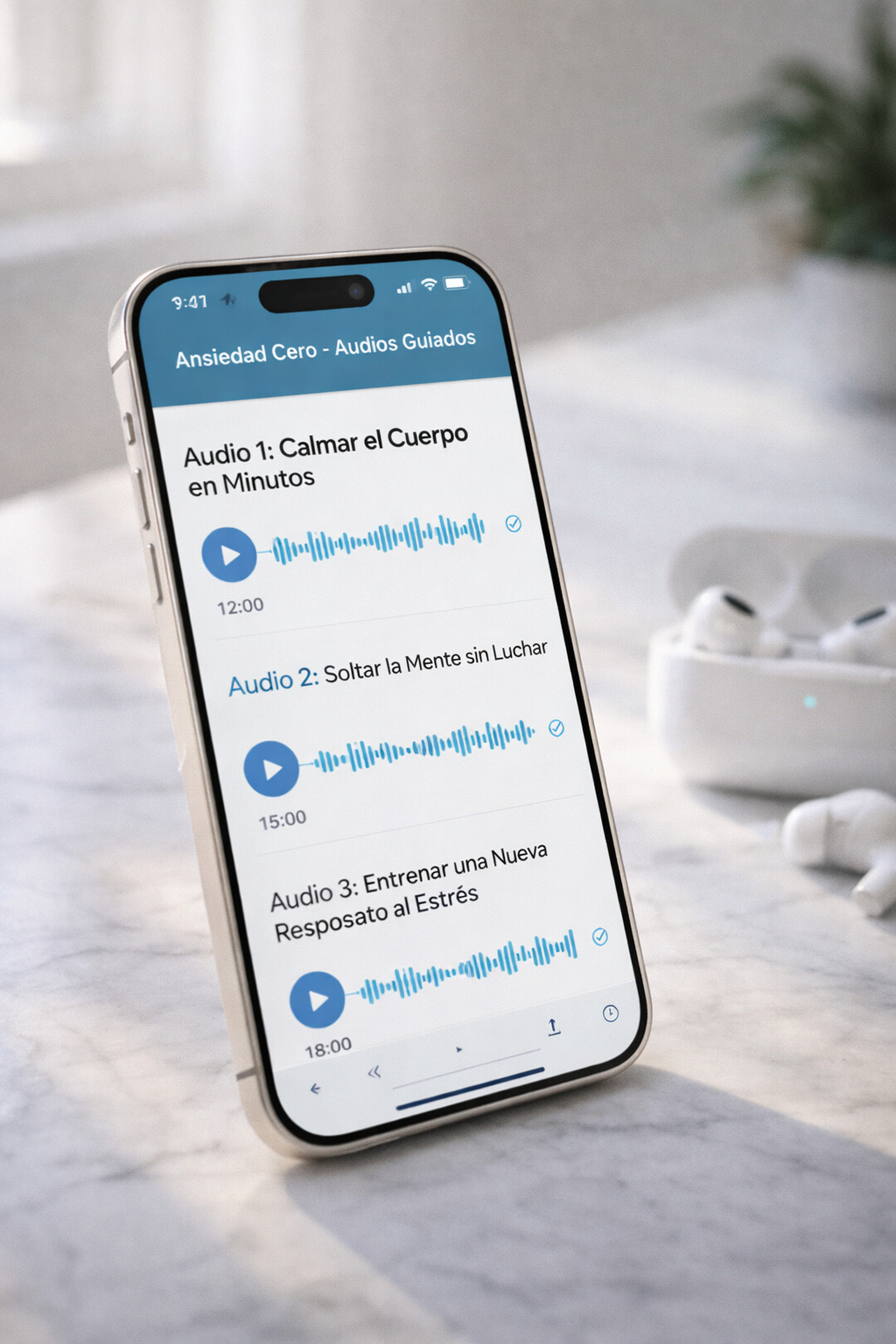 ✅ 3 Audios Guiados Profesionales ($24.99) → Audio 1: Calmar el cuerpo (12 min) → Audio 2: Soltar la mente (15 min) → Audio 3: Nueva respuesta al estrés (18 min)